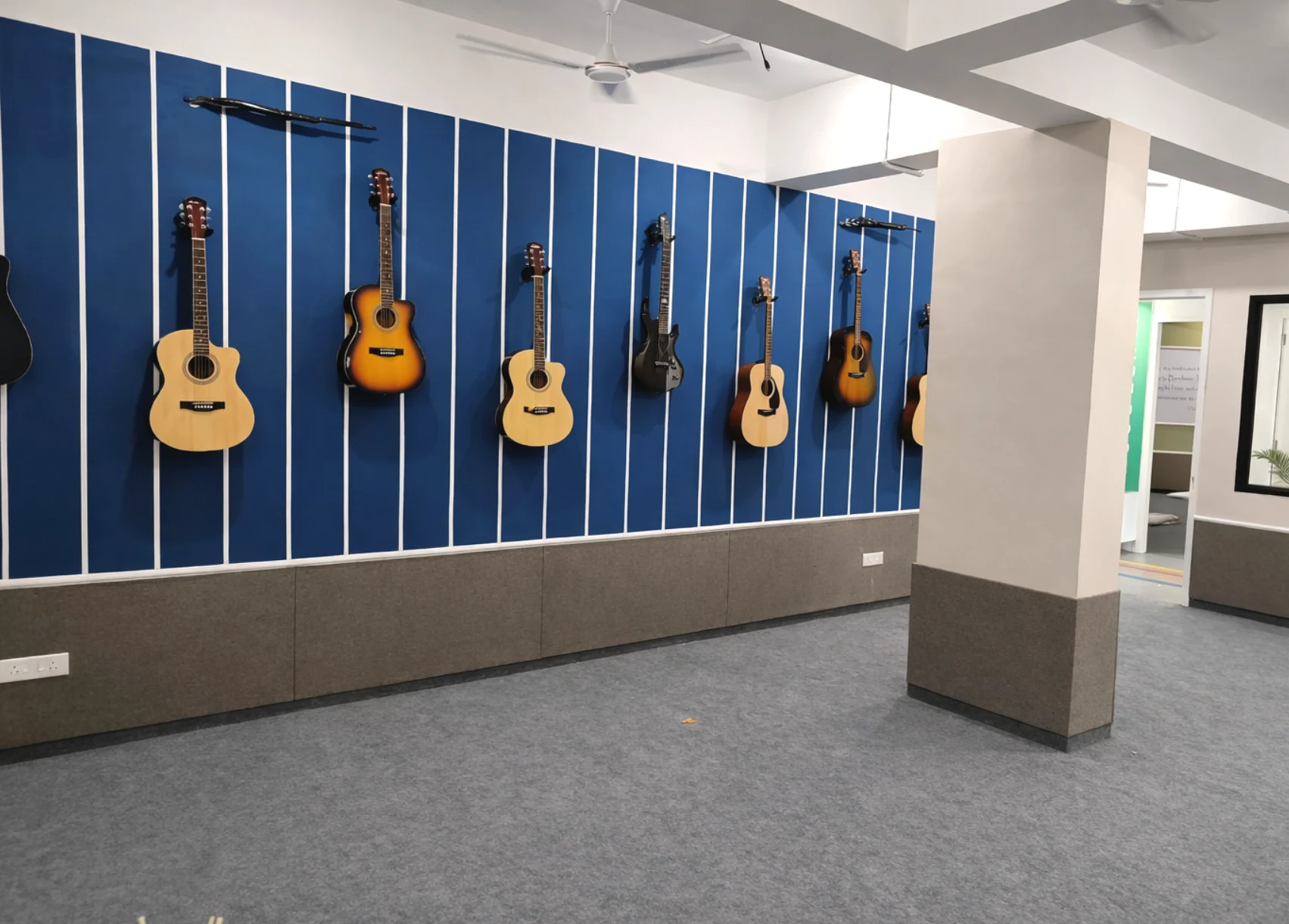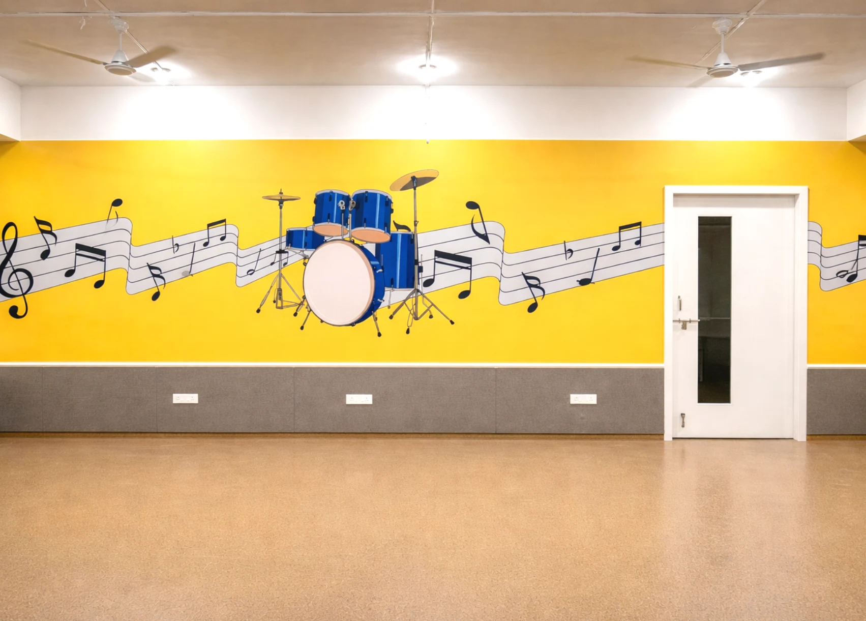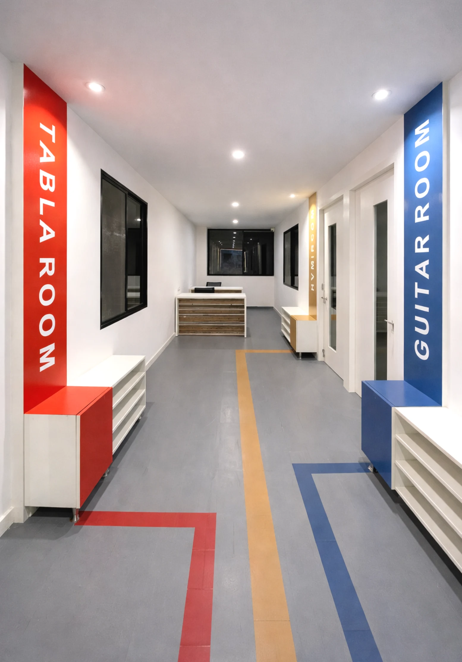 The layout maintains clean lines and functional planning, with durable flooring, acoustic panel elements, and spacious open areas to support performances and practice sessions. Bright accent walls paired with neutral bases ensure visual impact without overwhelming the space.