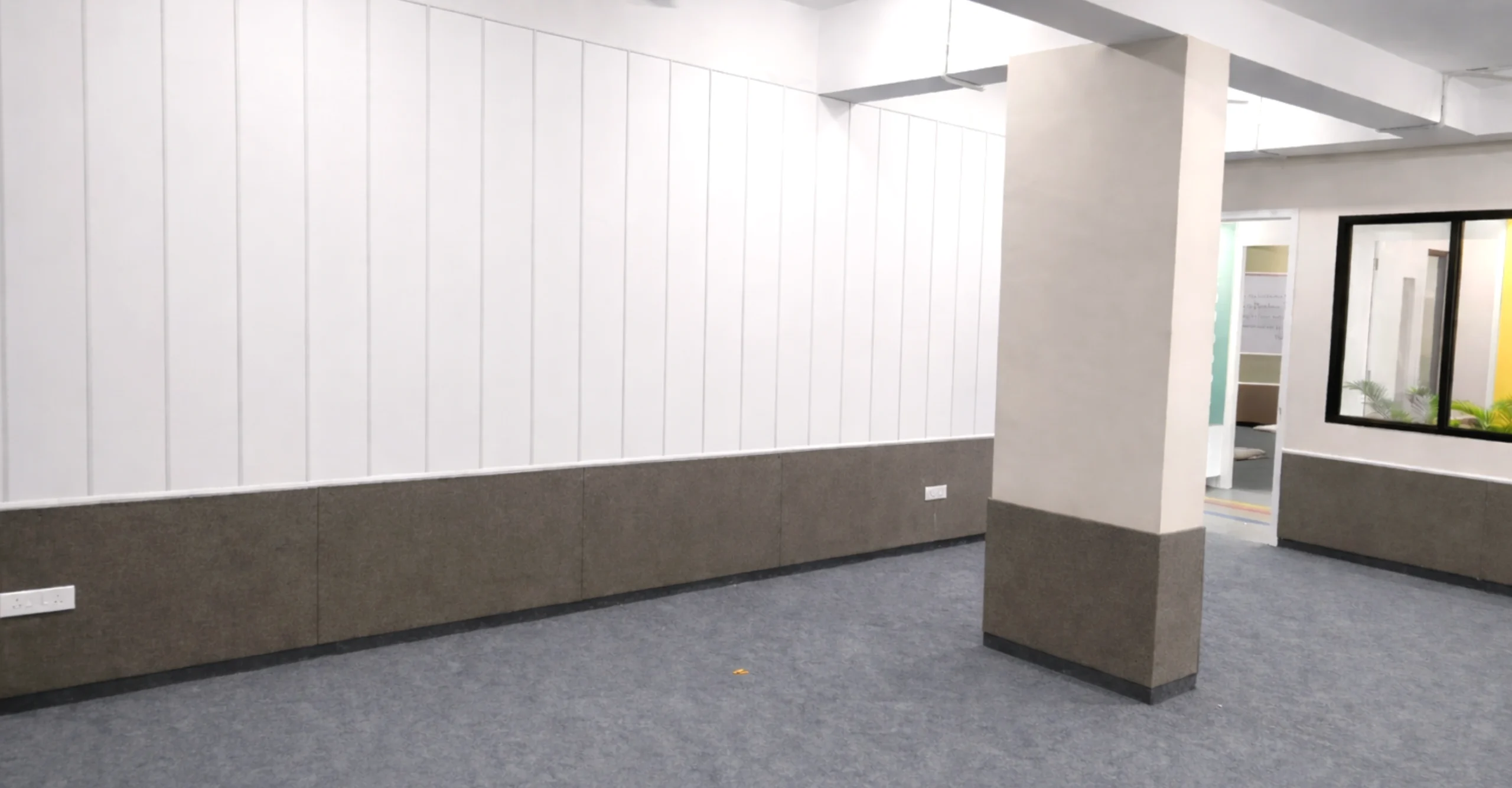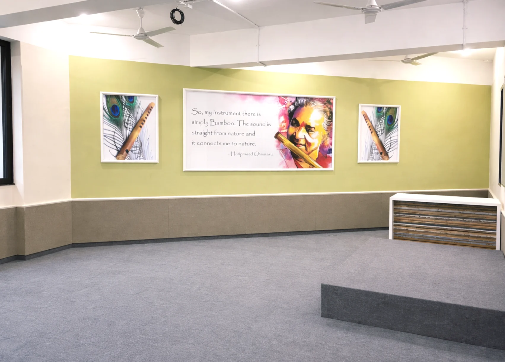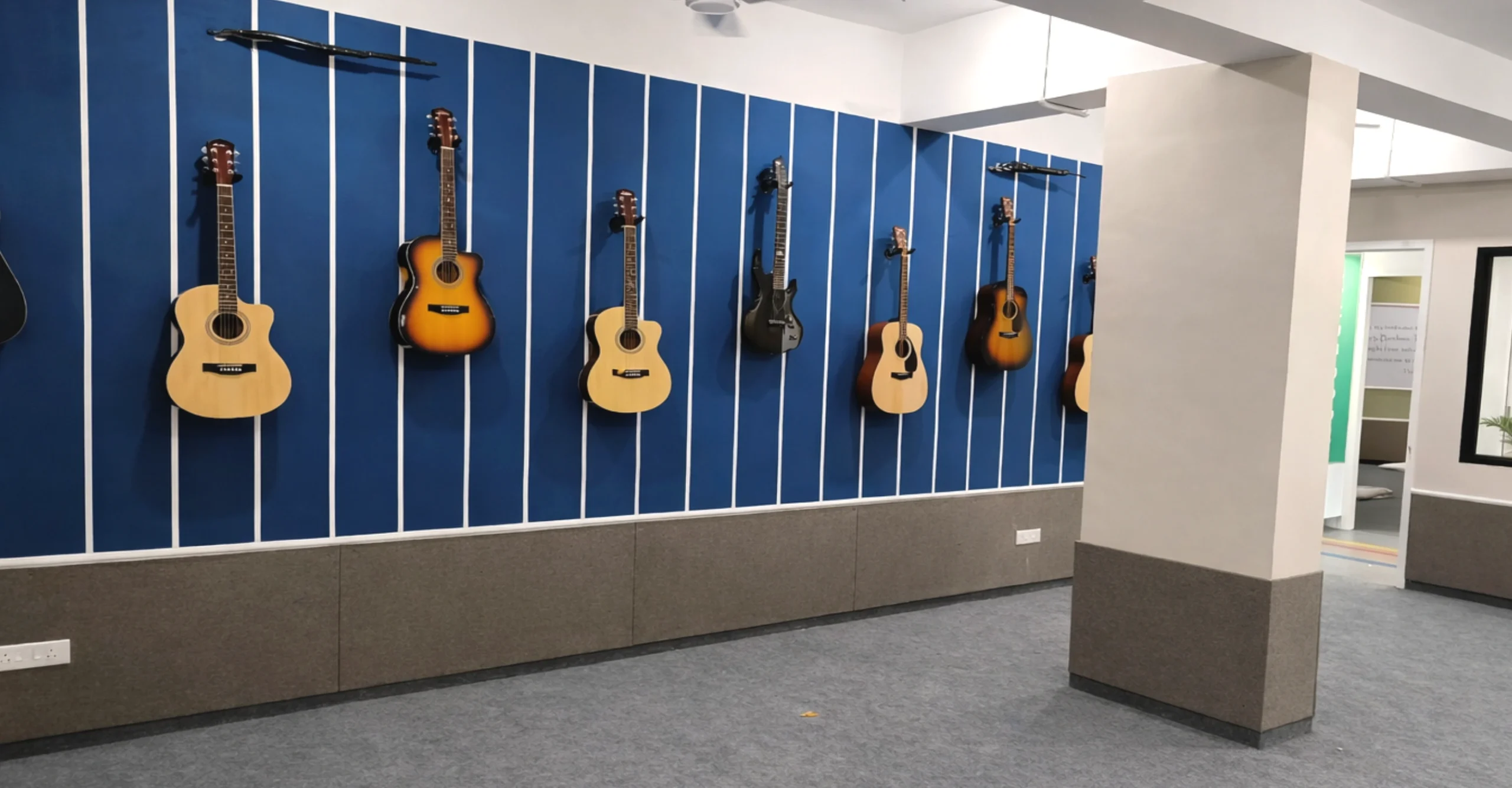 The layout maintains clean lines and functional planning, with durable flooring, acoustic panel elements, and spacious open areas to support performances and practice sessions. Bright accent walls paired with neutral bases ensure visual impact without overwhelming the space.
