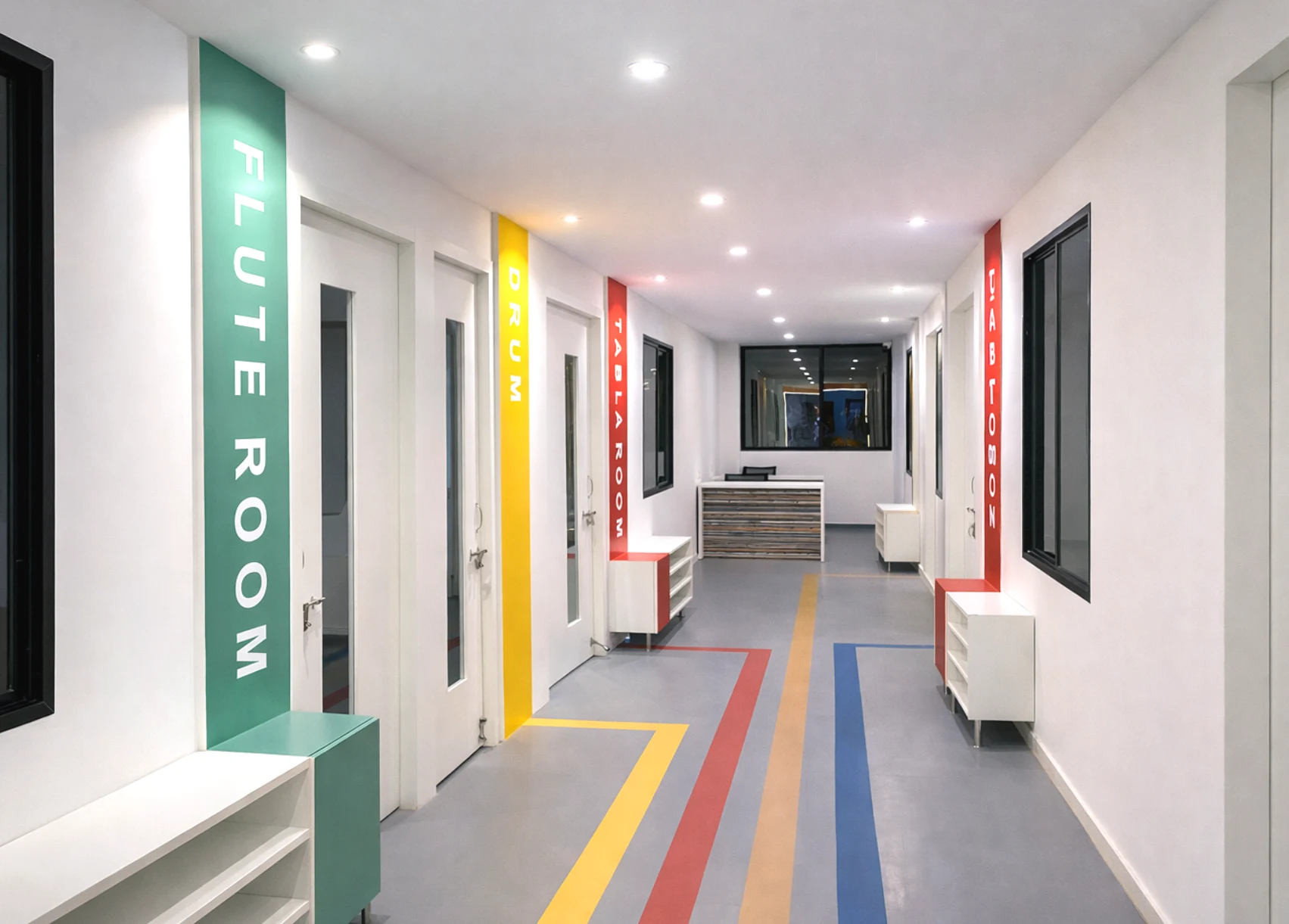 This music and activity studio is designed with a vibrant contemporary approach that energizes the learning environment. Bold wall graphics, musical-themed murals, and color-coded zones create a dynamic and engaging atmosphere for students.